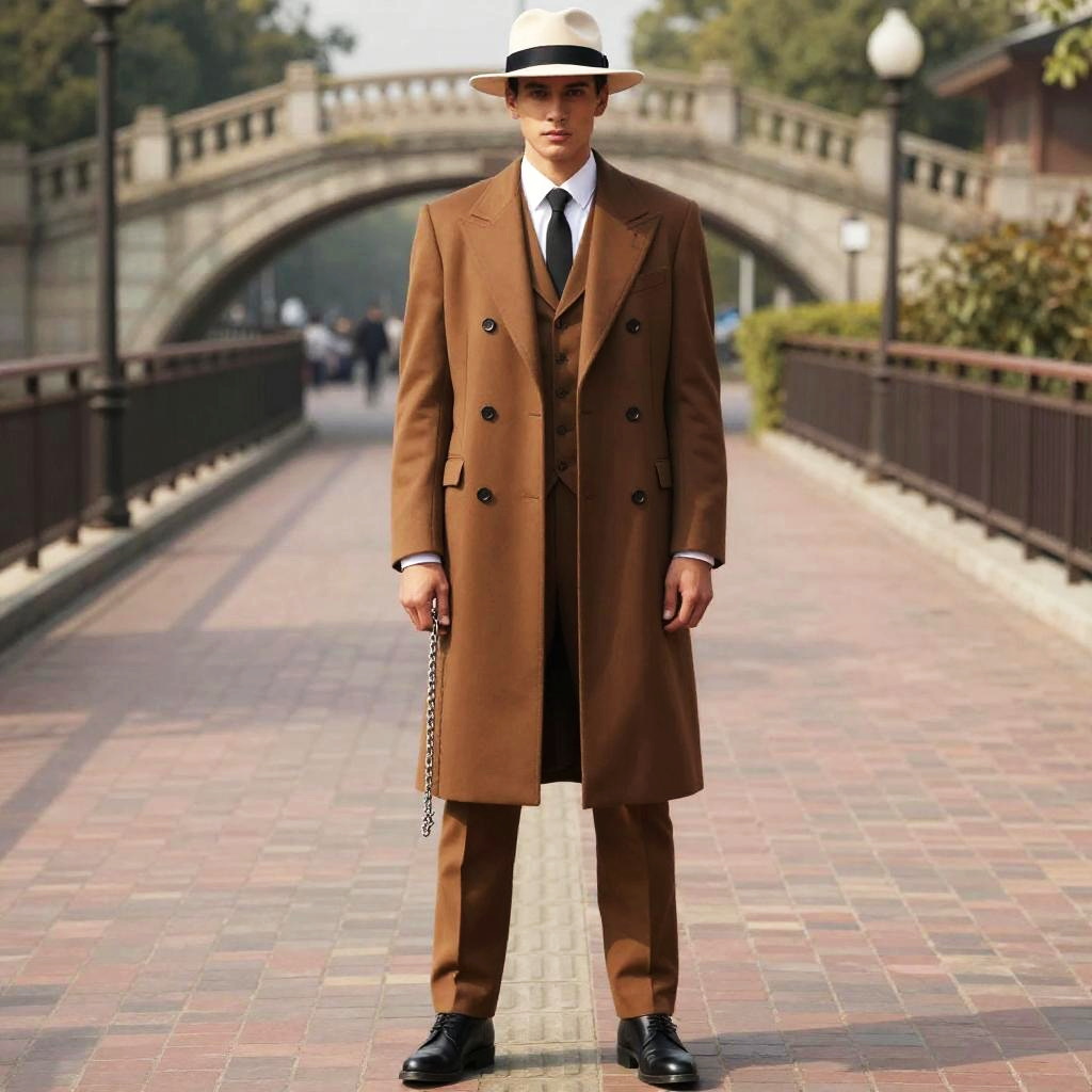 Photograph of a tall, slender man standing confidently on a sunlit, brick-paved path. He's wearing a brown, long-coat suit with wide lapels, a white shirt, and black tie. A white fedora hat sits on his head, and he's holding a chain in his right hand. The background shows a blurred, arched bridge and greenery. His style is vintage and stylish.