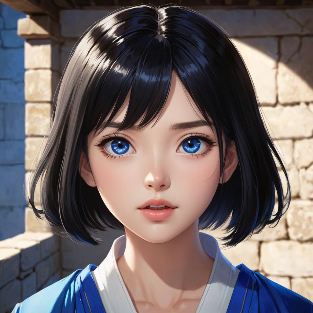 Solo, 1girl, blue eyes, looking at viewer, close-up, black hair, portrait, short hair, lips, shadow, traditional media, open mouth