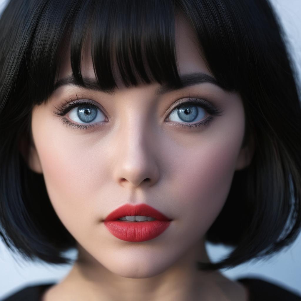 Close-up portrait of a young woman with striking blue eyes, dark hair, and soft pink lipstick. The image highlights her clear complexion and expressive gaze, set against a softly blurred background.