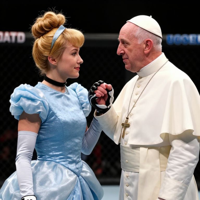 Cinderella the pope in an mma fight against joe rogan, photorealism, canon eos r3, 50mm, cinematic lighting, Photorealism
