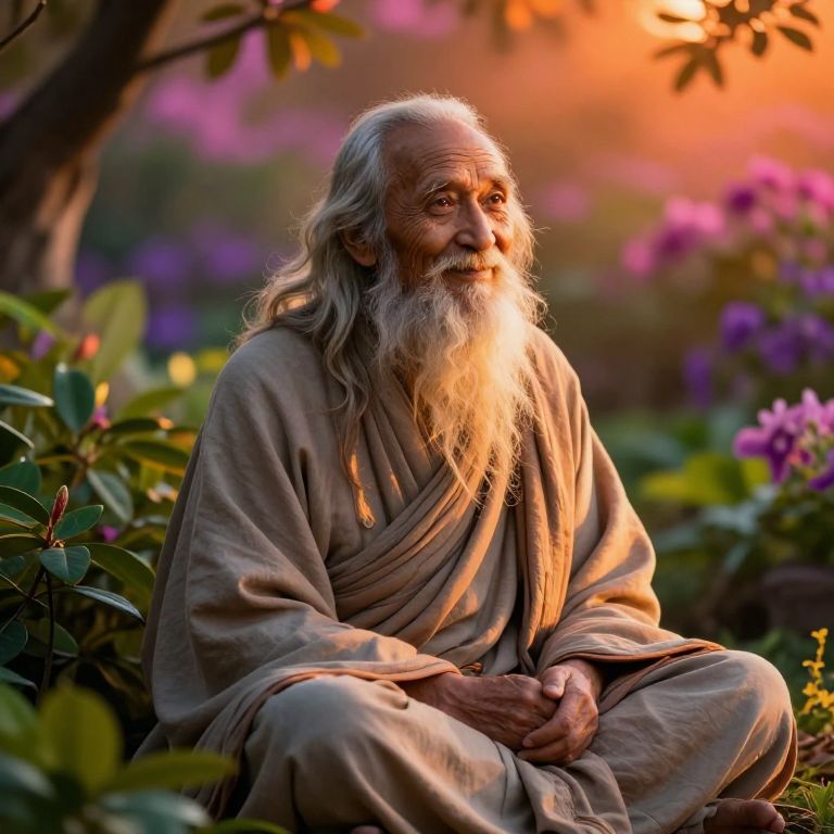 Photograph of an elderly man with a long, white beard and gray hair, sitting cross-legged in a vibrant garden at sunset. He wears a loose, beige robe that drapes over his shoulders and chest. His hands are clasped in his lap, and he gazes thoughtfully to the right. The background features blurred purple and pink flowers, green leaves, and a warm orange sunset glow filtering through the foliage. The lighting highlights his beard and robe, creating a serene and contemplative atmosphere. The image combines natural beauty with a sense of wisdom and tranquility.