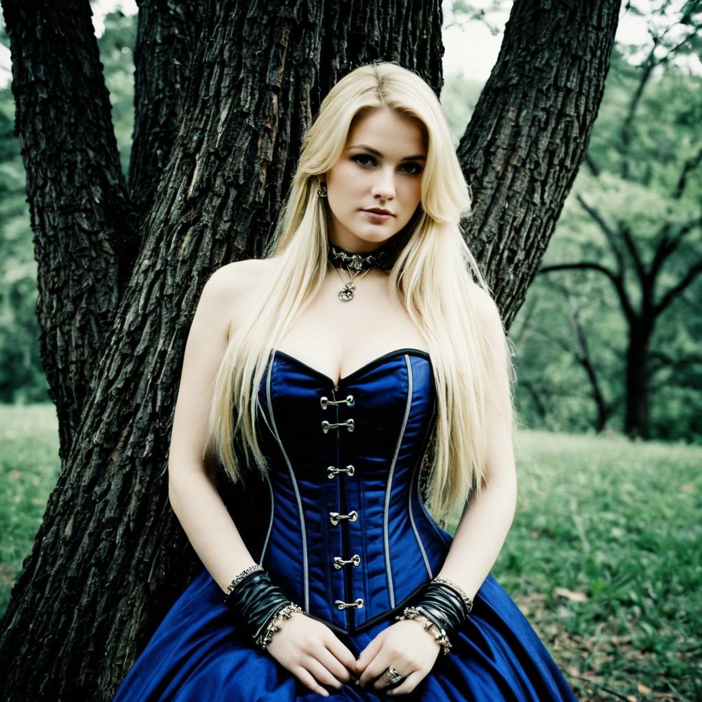 Master cosplay,1girl, blonde hair, long hair, dress, solo, tree, jewelry, realistic, bracelet, corset, bare shoulders