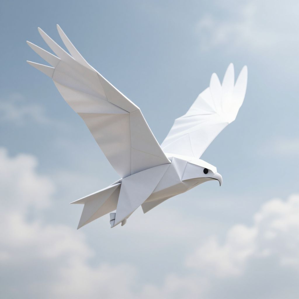 A majestic white hawk soars gracefully against a backdrop of ethereal clouds, its wings outstretched in a serene 3D-rendered depiction that evokes the timeless elegance of origami art, as if crafted from the very fabric of the sky.
