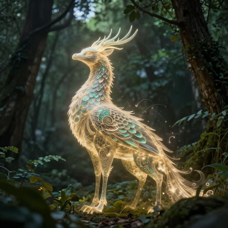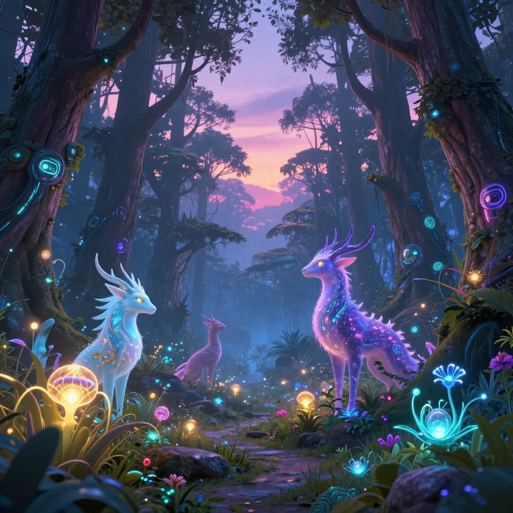 Digital artwork of a glowing, bioluminescent, blue-scaled, mythical creature with intricate neon patterns, standing in a dark, enchanted forest with