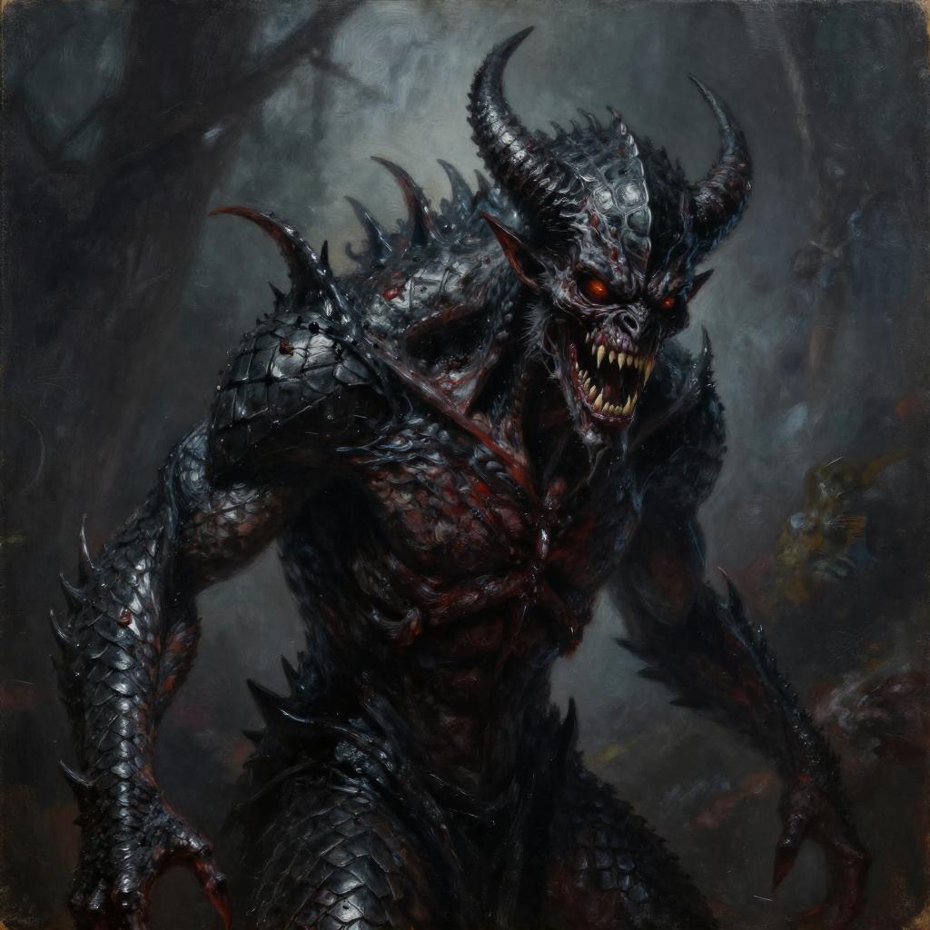 A closeup portrait of a demonic monster with black scales that invokes fear, d & d, fantasy setting, horror environment, morbid colors, dark lighting, atmospheric, cinematic, moody, in the style of diego koi, gina heyer, luiz escanuela, art by alyssa monk, depth, hyperrealism, rule of thirds, golden ratio, oil on canvas, 8k