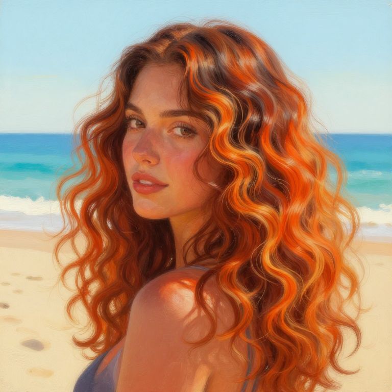 Wavy hair in Spanish style, sunlit beach background, vibrant colors, flowing locks, detailed texture, soft waves blending naturally, realistic portrait painting