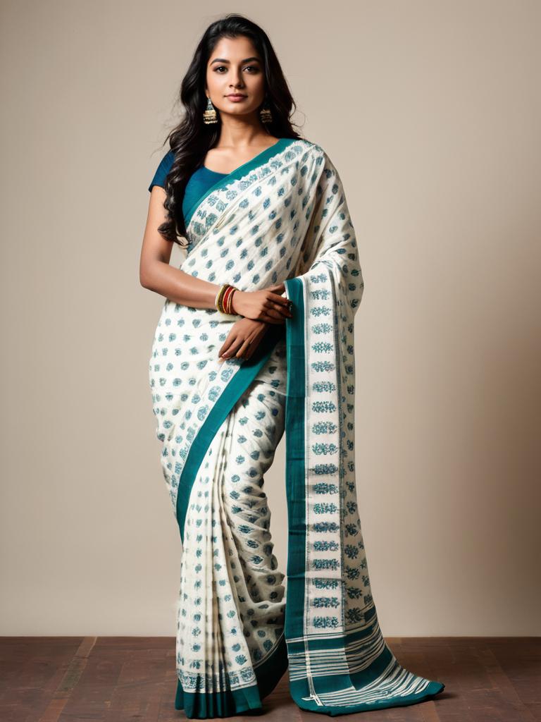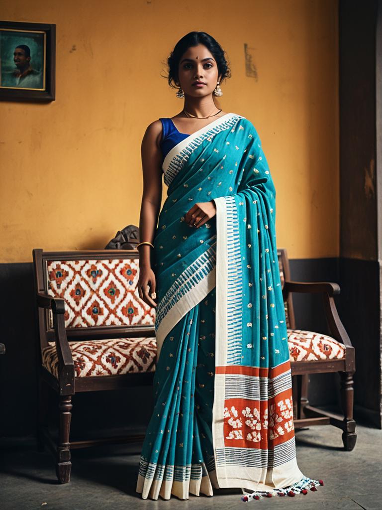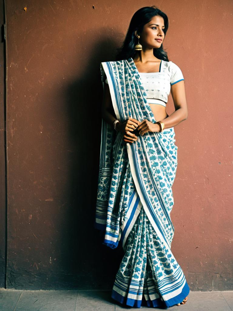 Woman in Malmal Cotton Saree, full-body traditional attire photo --sref 1388