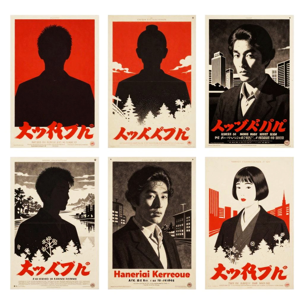 A series of vintage Japanese movie posters with surreal and expressionistic art style, shadowy figures with exaggerated facial expressions, traditional Japanese landscapes blended with modern urban elements, bold color contrasts in reds, blacks, and whites, celebrating mid-century film art.