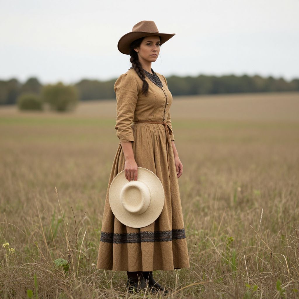 Prairie Pioneer Woman Costume, woman in brown dress and hat standing in field with hat on
