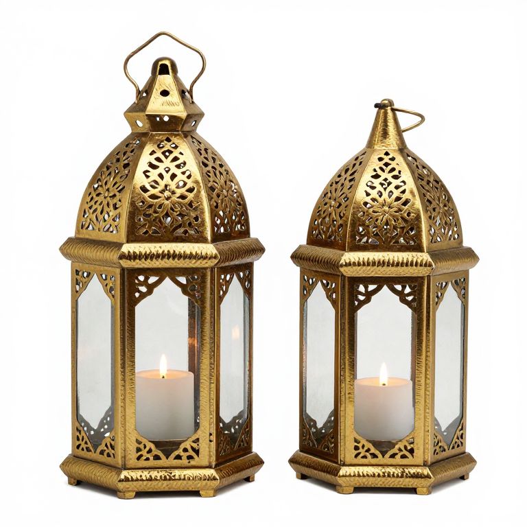 Two intricately designed vintage Moroccan lanterns, crafted in gold metal with ornate cutout patterns, stand side by side as candle holders, featuring hexagonal bases and glass panels that encase lit candles, perfect for home decoration.