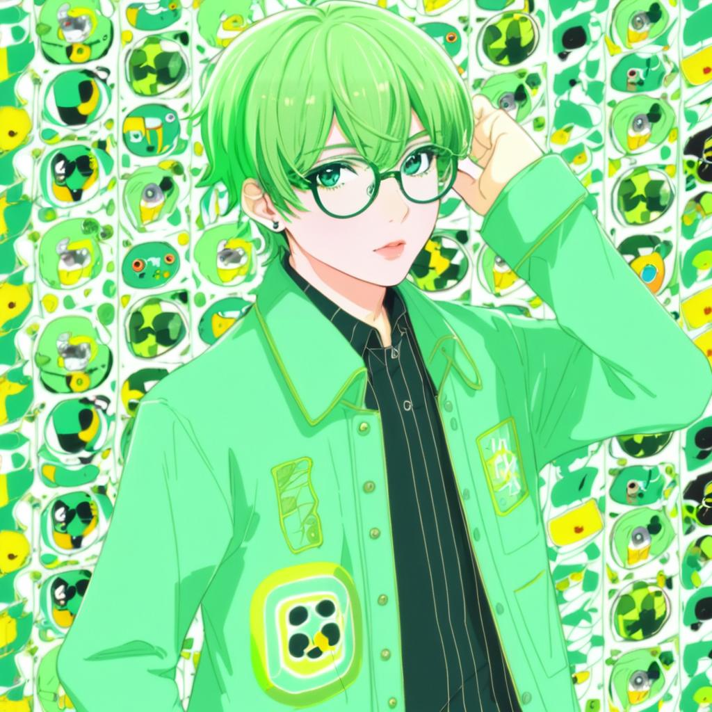 Digital anime-style illustration of a young male character with short green hair and green eyes, wearing round glasses. He is dressed in a light green jacket with patches over a dark striped shirt, posing against a patterned backdrop filled with green and yellow circular designs.