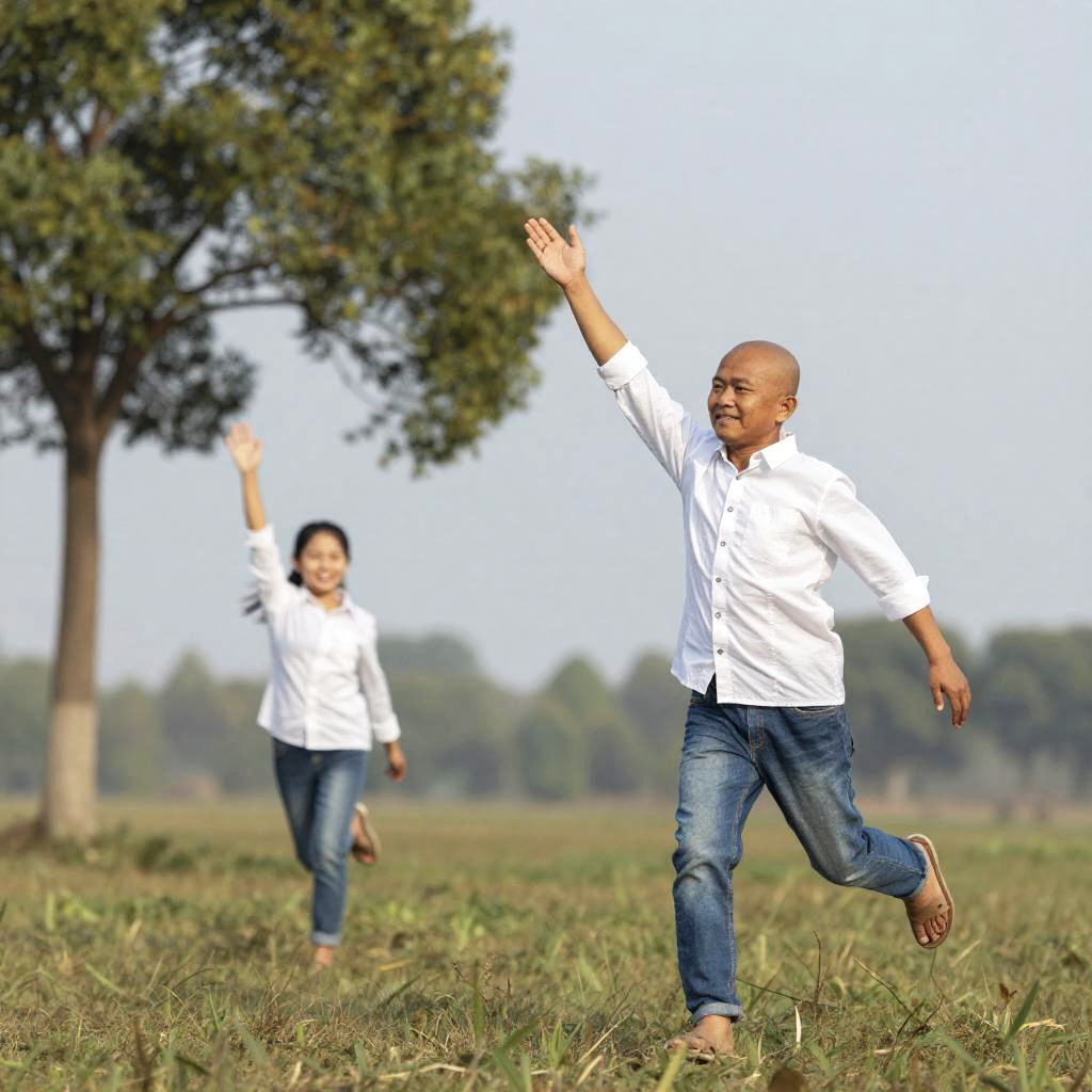 A photograph of an Asian woman with fair skin and shoulder-length black hair, standing in a vast, dry, grassy plain under a clear, deep blue sky. She's wearing a bright orange, long-sleeved, button-up shirt that contrasts with the blue sky. Her eyes are closed, and her head is tilted back, letting the wind blow through her hair. Mountains are visible in the distant background. The lighting is natural, highlighting her serene expression and the vivid colors of her shirt and the sky.