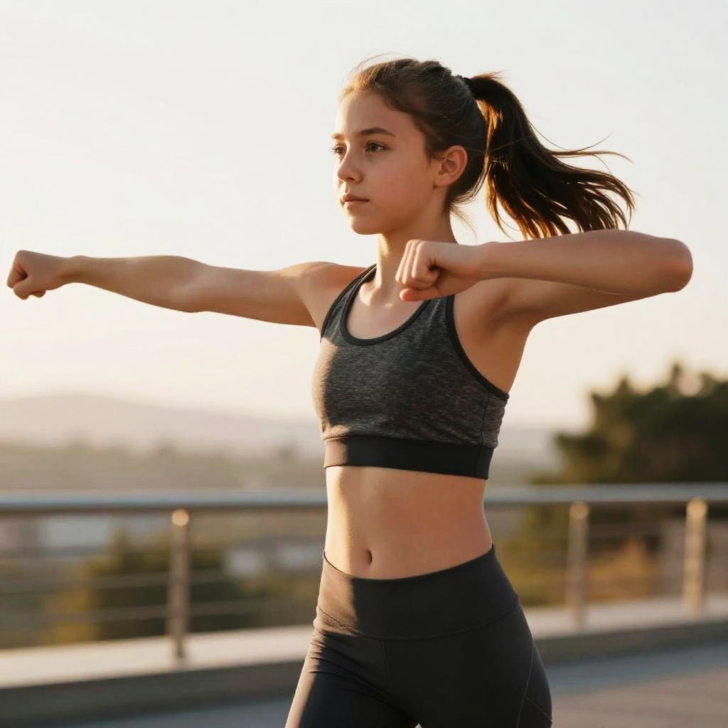 12 year old girl abs, energetic girl exercising outdoors, toned midsection visible, sunrise lighting, motivational atmosphere, realistic human figure, sharp details