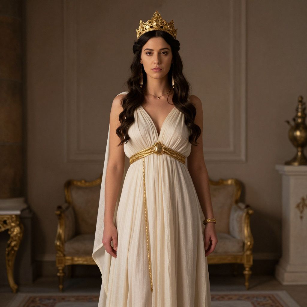 Photograph of a woman with long, wavy black hair wearing a gold crown, a white, pleated, sleeveless gown with a gold belt, and a sheer white shawl draped over her right shoulder. She stands in an elegant, dimly lit room with ornate, gold-accented furniture, including a chair and a pedestal. The background features beige walls with classical moldings. The woman's expression is serious, and she wears a gold bracelet on her right wrist and a delicate necklace. The overall style is regal and luxurious.