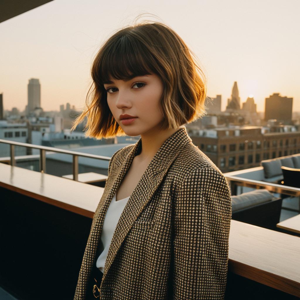 Fashion Model with Choppy Bob Hairstyle and Leather Blazer