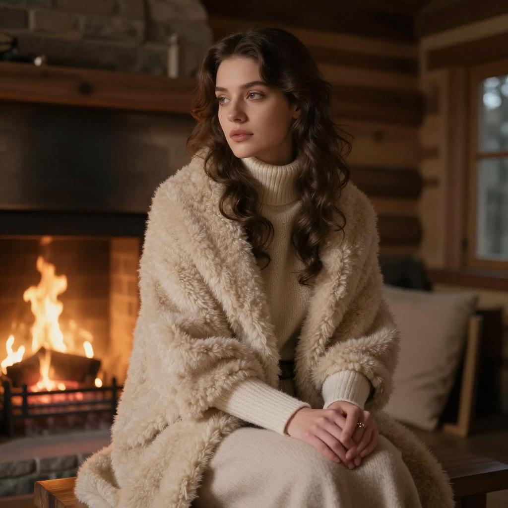 A stunning intricate full color portrait, official art, masterpiece, best quality, unity 8k wallpaper, ((photorealistic:1.4)), ultra detailed, extremely detailed, elegant, beautiful, aesthetic, romanticism, A woman wrapped in a cozy winter ensemble, sitting by a fireplace in a cabin, illuminated with soft and warm lighting to evoke a sense of comfort and tranquility.