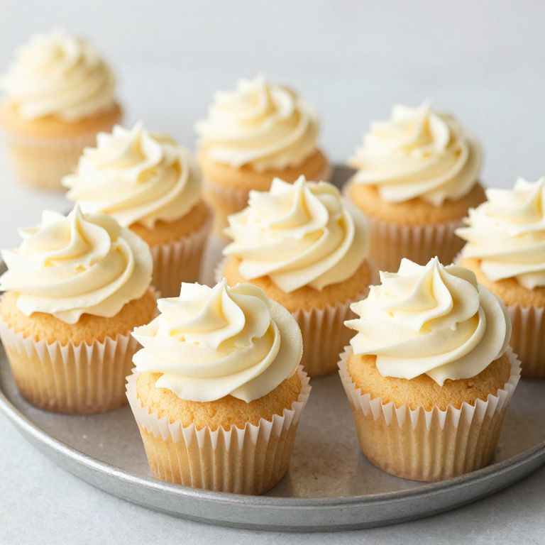 Photograph of nine vanilla cupcakes with swirls of creamy white frosting, each in a beige paper liner, arranged on a silver baking tray. The cupcakes have a golden-brown, moist texture. The background is a soft, out-of-focus white, emphasizing the cupcakes. The lighting is bright, highlighting the smooth, glossy texture of the frosting and the soft, fluffy texture of the cake. The cupcakes are evenly spaced, creating a balanced, appetizing display.