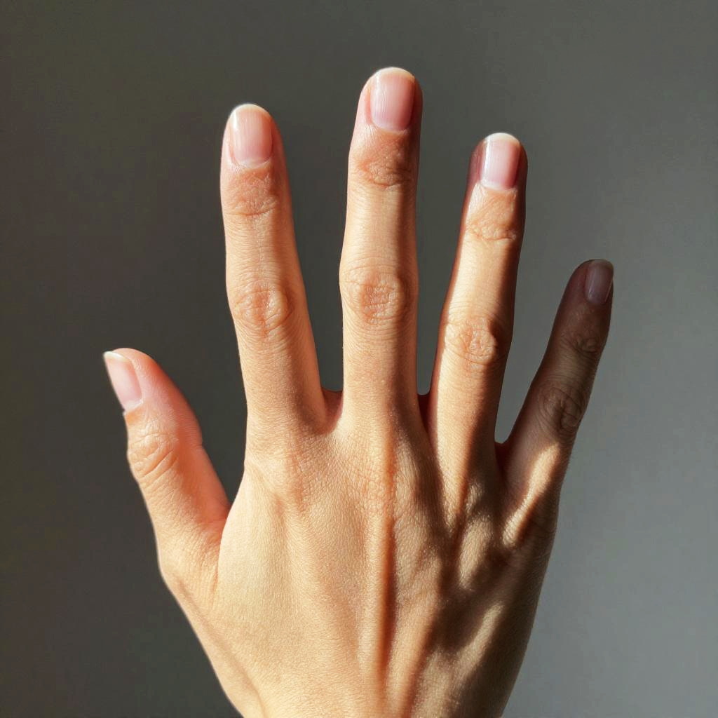 Photorealistic close-up image of a human hand with five fingers visible. The hand is illuminated by dappled sunlight, highlighting detailed skin texture and veins on a neutral background. Studio lighting enhances the natural skin tone and fine details of the fingers and nails.