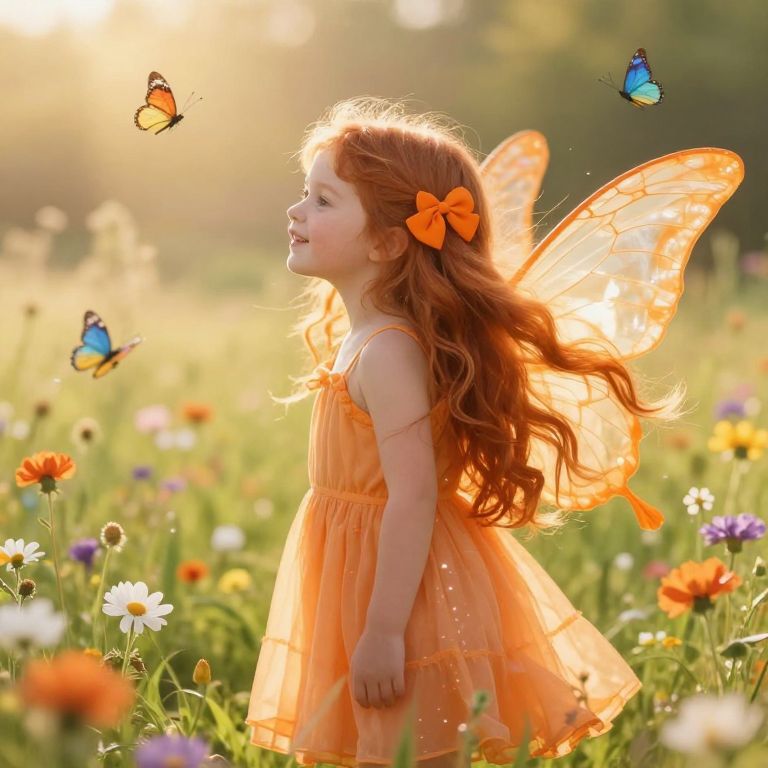 A vibrant young girl with long, flowing auburn hair adorned with a bright orange bow, standing in a sunlit meadow bathed in golden morning light, her delicate, translucent orange wings gently fluttering behind her as if in motion, glowing softly with a warm, ethereal light that casts a subtle shimmer in the air, surrounded by a lush array of blooming flowers and colorful butterflies dancing in the breeze, her joyful expression radiating playful magic and whimsy, as if she’s part of a living dream, the scene painted with soft pastel tones and a sense of gentle wonder.