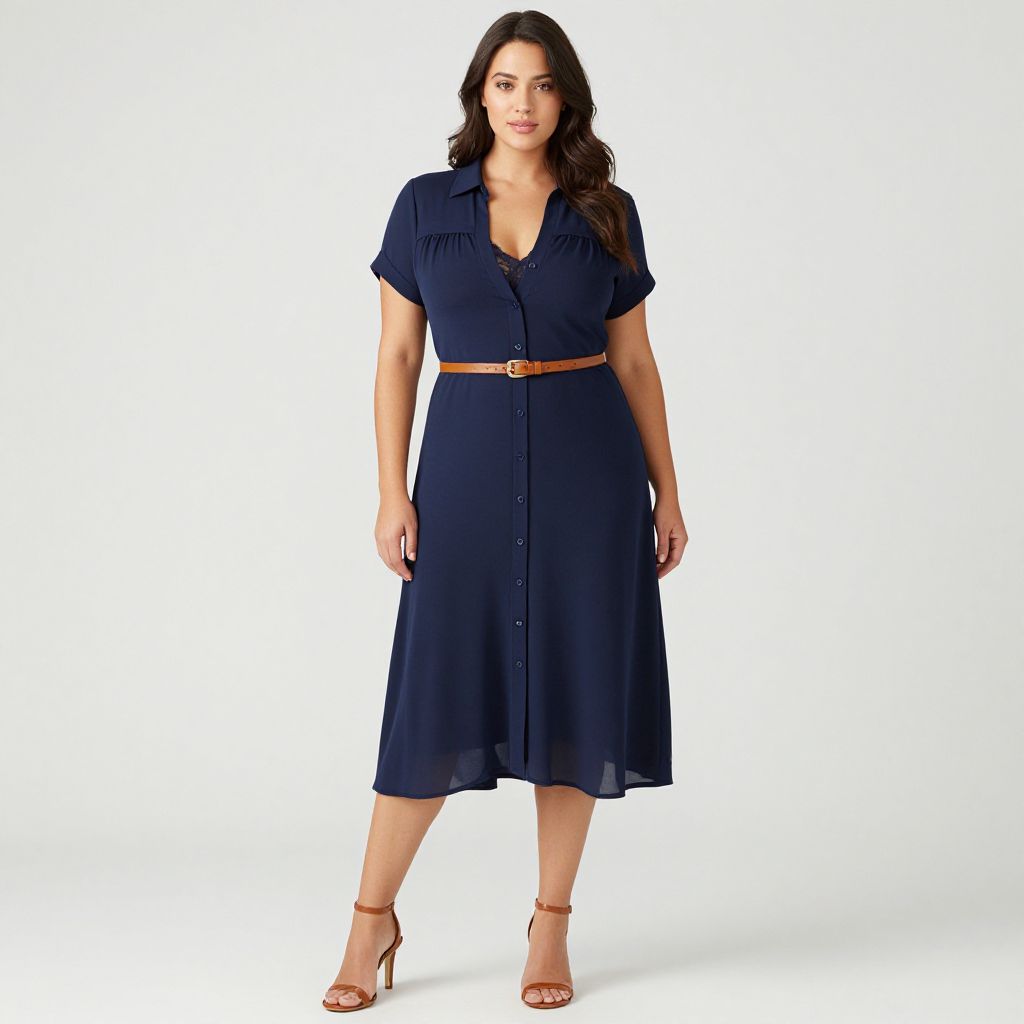 "Woman, smart casual, navy blue shirt dress with a mid-calf length, V-neckline with lace camisole peeking through, short cuffed sleeves, brown leather belt cinching at the waist, full button placket, soft fabric with a gentle flow, paired with brown leather heeled sandals, white backdrop. Sexy. Pretty face and beаutiful eyes. Big breasts."
