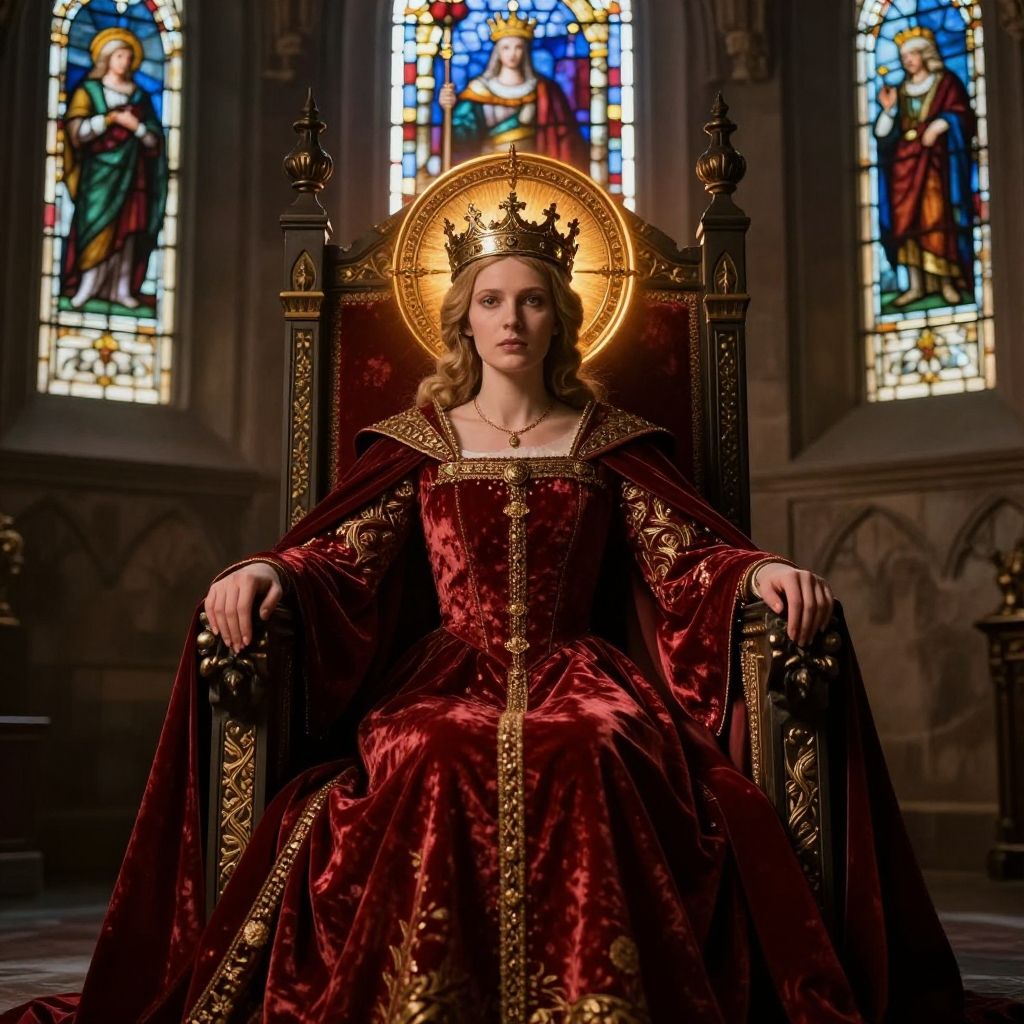 Medieval halo radiating around a crowned queen in a medieval throne room, rich velvet and brocade fabrics, stained glass windows casting colorful light, regal and solemn mood