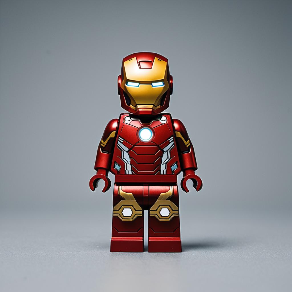 High-resolution digital design of an Iron Man-themed minifigure, shown in full body length with smooth edges and sharp lines. The figure has a metallic red and gold suit with illuminated blue eyes and circular chest piece, featuring classic LEGO-style articulation and neutral expression. Centered on a gradient gray background, this iconic customizable avatar design is ideal for profiles or collections.