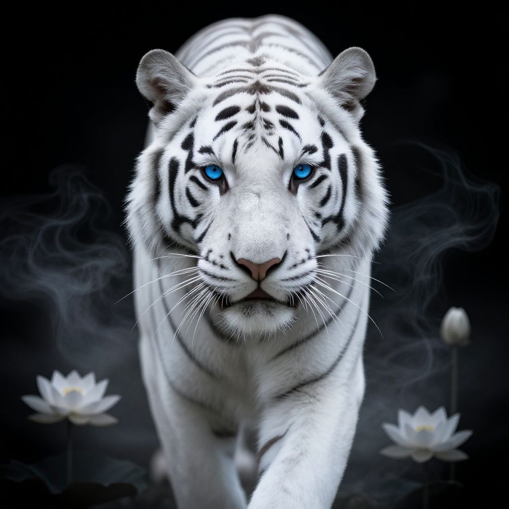 Black background showcasing a majestic white tiger with piercing blue eyes, surrounded by ethereal mist and delicate floating lotus flowers, a blend of realism and fantasy, high detail, elegant composition