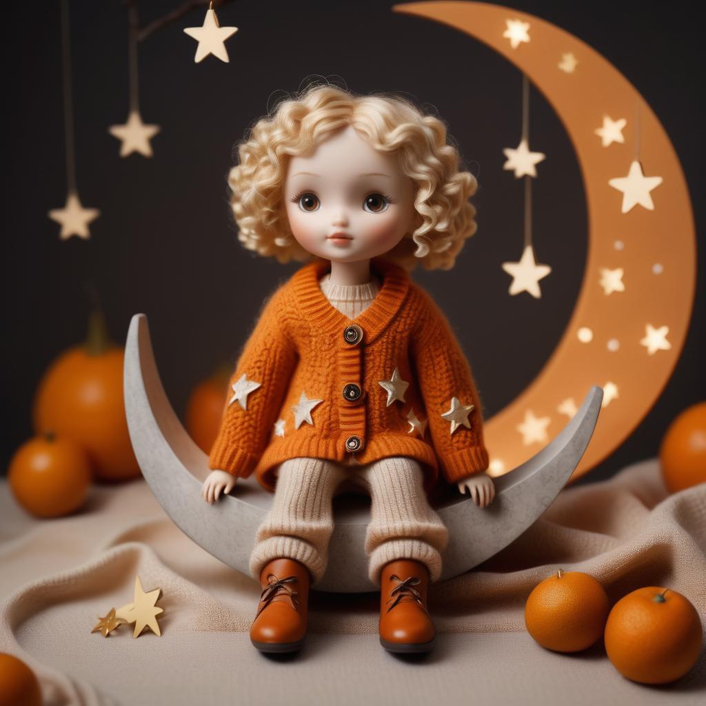 A whimsical scene of a small fairy-like figure with curly blonde hair sitting on a crescent moon made of soft textured material, wearing a cozy orange knit cardigan, beige top, dark pants, and light brown boots, gentle warm lighting with golden star speckles around, soft pastel and muted orange and beige color scheme, indoor cozy atmosphere