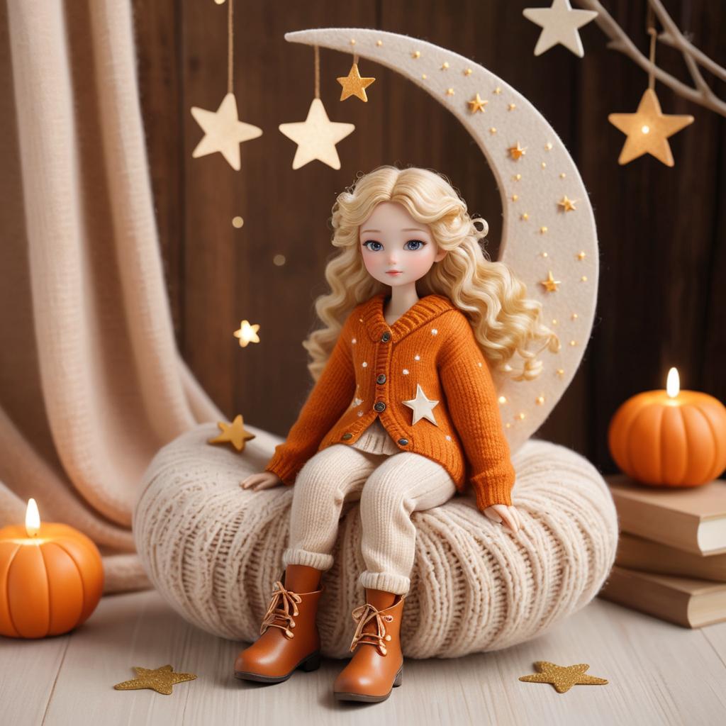 A realistic fashion doll with curly blonde hair, dressed in a cozy orange and beige knitted cardigan, beige pants, and brown boots, sitting on a textured gray block. The background includes autumn-themed decorations such as a large crescent moon with star motifs, pumpkins, a ball of yarn, dried plants, and glittery ornaments, creating a warm and whimsical atmosphere.