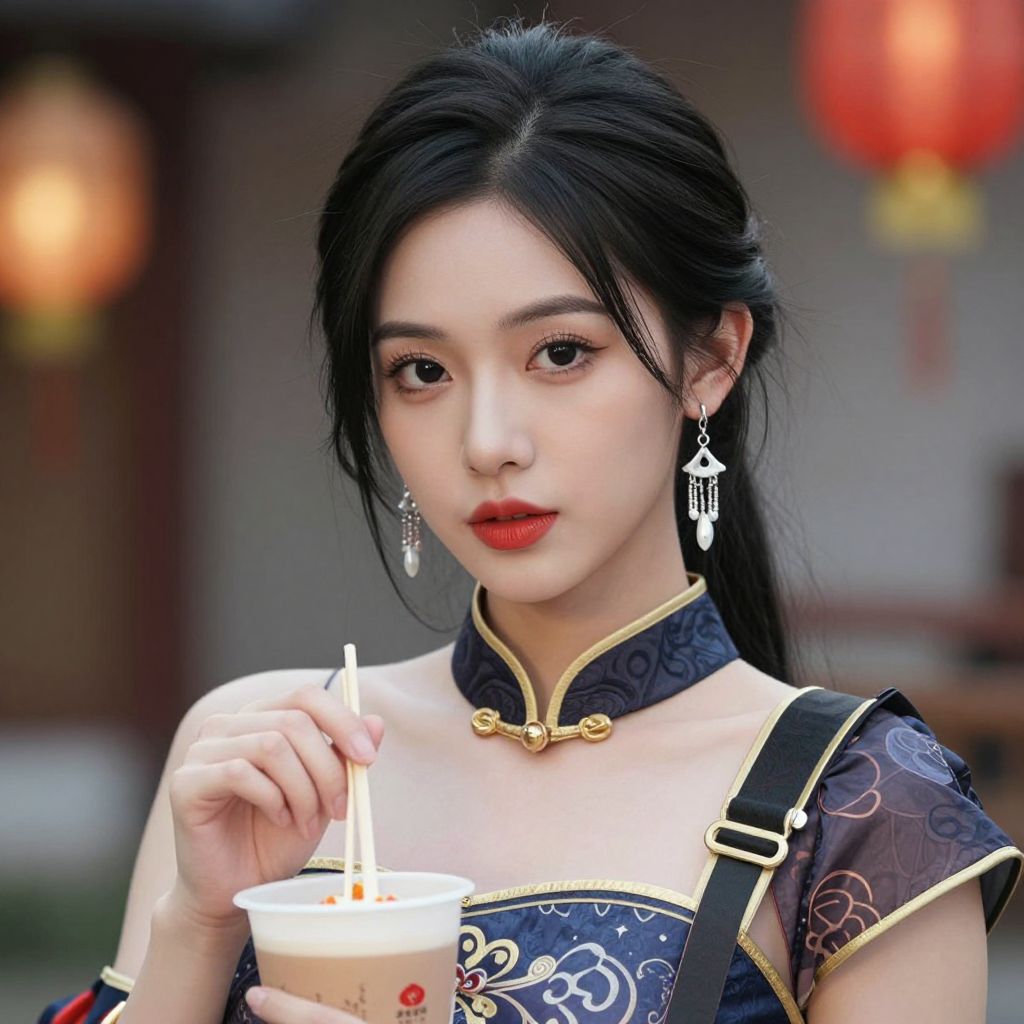 Photorealistic digital portrait of an Asian woman with long black hair, red lipstick, and traditional Chinese attire, holding a bubble tea cup. Red lantern