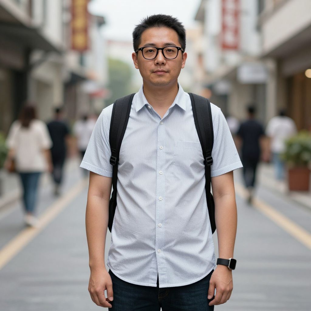 Photograph of an Asian man standing on a bustling city street. He has short black hair, wears black-rimmed glasses, and is dressed in a white, short-sleeved, button-up shirt with black pants. He carries a black backpack and has a black wristwatch on his left wrist. The background is blurred, showing a narrow street with people walking in both directions, and buildings with signs and potted plants on either side. The street is lined with yellow markings, and the overall color palette is muted, with the man's white shirt standing out prominently.