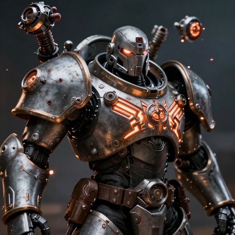 Close-up of a warforge warrior, battle-hardened with scratches and dents, glowing runes on its chest plate, surrounded by floating mechanical components and sparks, highlighting a blend of magic and technology, set against a dark, moody background