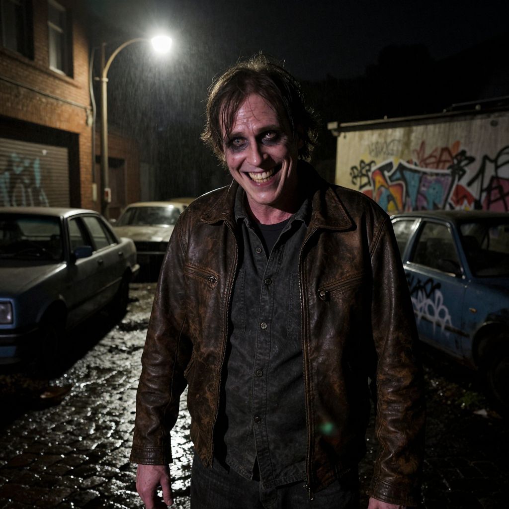 Photograph of a disheveled man with messy brown hair and dark, smudged makeup around his eyes, smiling widely. He wears a dark, worn leather jacket over a black shirt. The background features a dimly lit, rainy urban street with graffiti on a building, old cars parked on the wet pavement, and a bright street lamp illuminating the scene. The image has a dark, moody, and slightly eerie atmosphere, with the man's makeup and weathered appearance adding a haunting element.