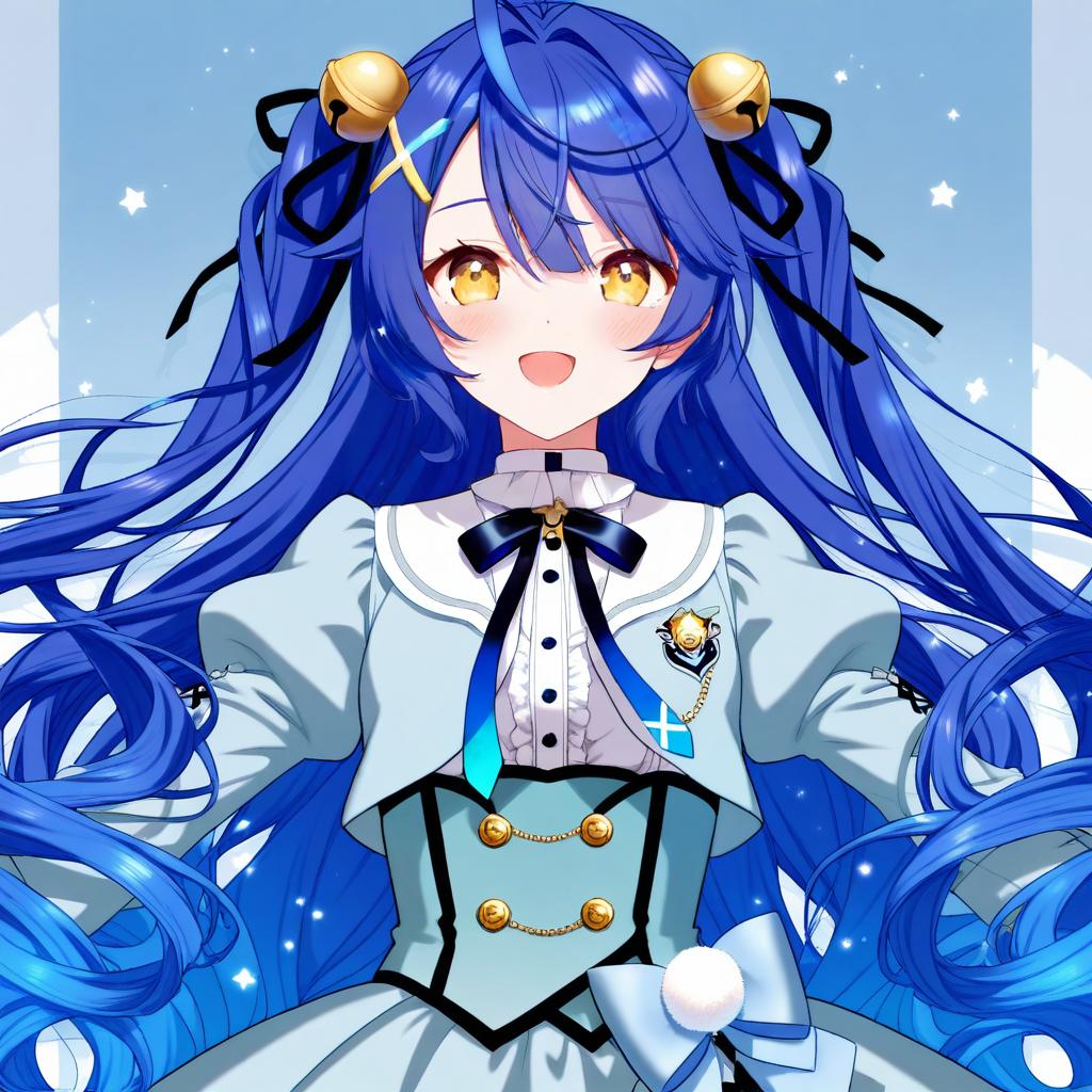Amamiya kokoro, nijisanji, 1girl, skin fang, yellow eyes, hair between eyes, blue hair, very long hair, long hair, x hair ornament, ahoge, two side up, twintails, hair bell, hair ribbon, small breasts, virtual youtuber, virtual youtuber, jingle bell, by artist yui toshiki, animagine