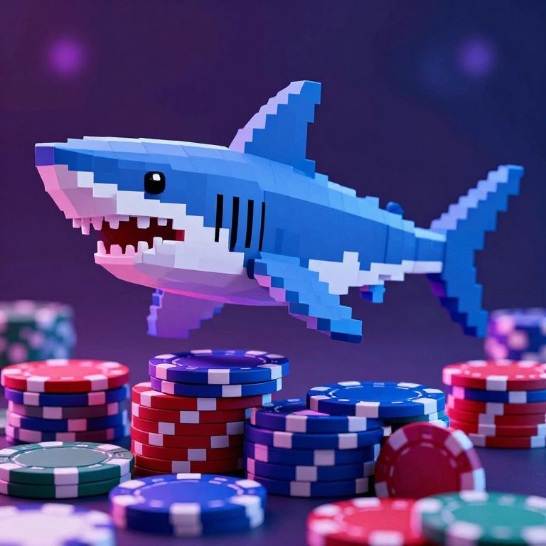 A pixelated, synthwave-style shark carving with neon colors, standing on a stack of poker chips.