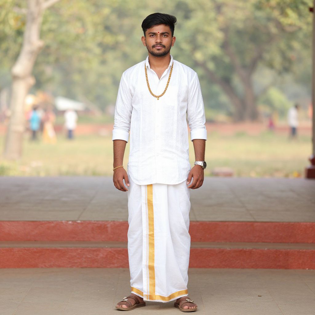 Photograph of a young Indian man with short black hair and beard, wearing a white traditional outfit with yellow stripe, gold necklace, and brown sandals,