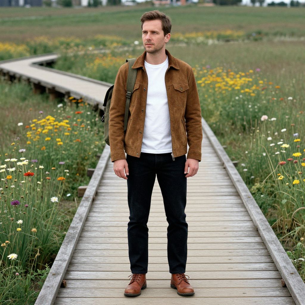 A man, urban explorer suede jacket, black slim-fit dark jeans, white cotton crew-neck t-shirt, brown leather chukka boots, olive green canvas backpack, wooden boardwalks winding through vibrant wildflowers, eastman film stock, thoughtful expression, serene atmosphere. Man has masculine face and piercing eyes