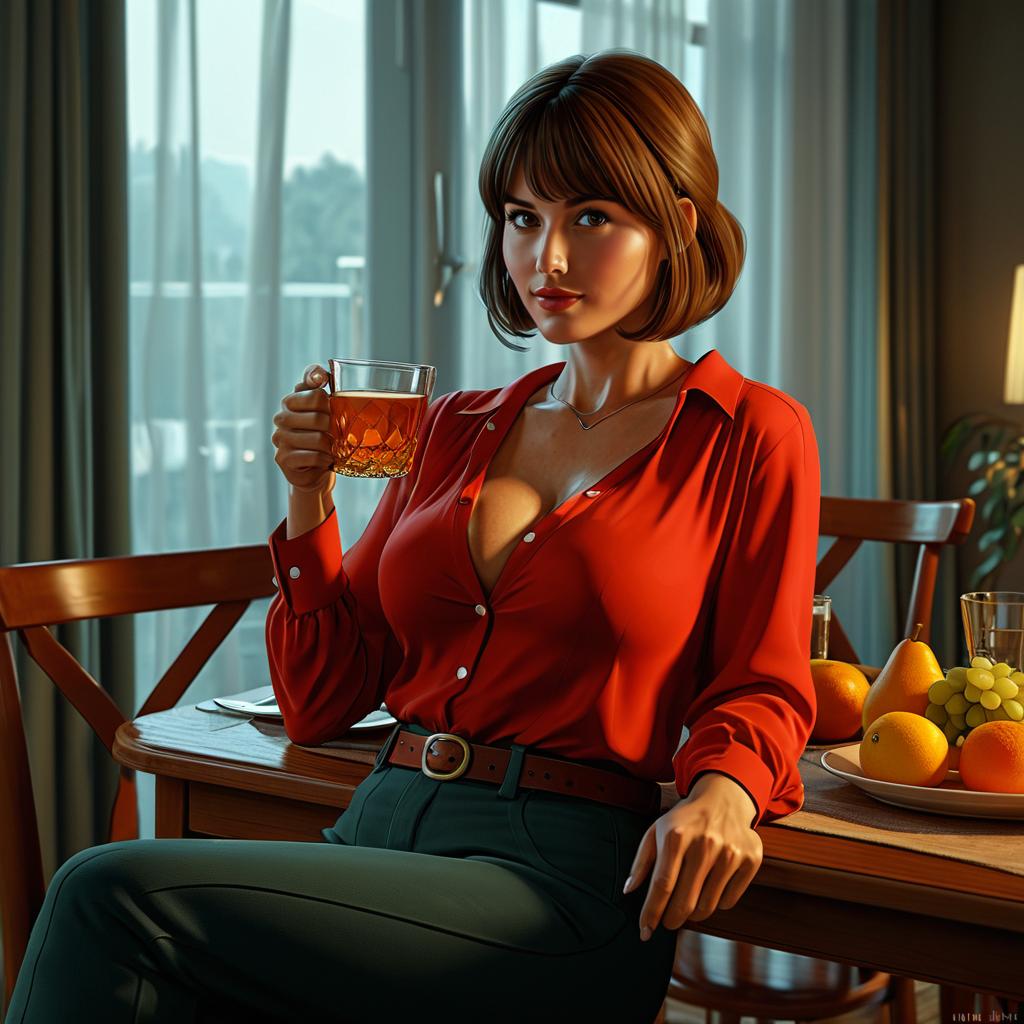 This is a digital artwork of a woman with fair skin and straight, dark brown bobbed hair, sitting at a wooden dining table. She wears a red, button-up blouse with a deep neckline that reveals a gold necklace and accentuates her ample cleavage. Her high-waisted, dark blue pants are cinched with a brown belt. She holds a glass of amber-colored liquid in her right hand, raised slightly. A plate of oranges, lemons, and grapes is on the table to her right. The background features tall, sheer curtains with soft light filtering through, creating a warm, inviting ambiance. Her expression is confident and slightly seductive.