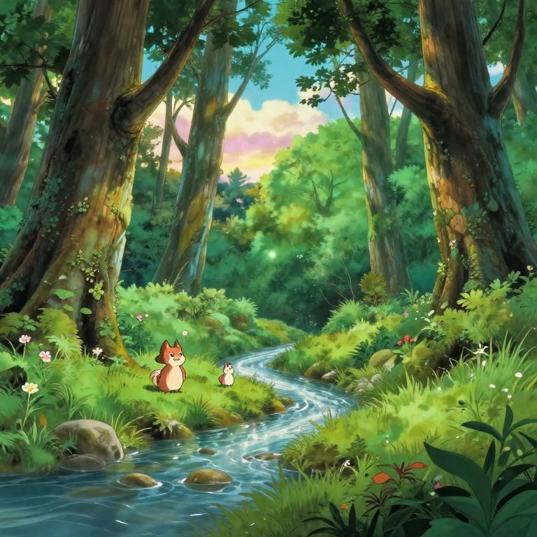 Anime park background filled with fantasy elements such as floating islands, crystal-clear lakes, giant flowers, mystical creatures roaming around, and a wide open sky with fluffy clouds and sparkling stars beginning to appear.
