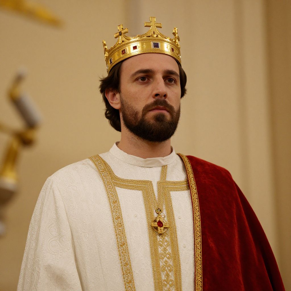 Photograph of a bearded man with dark hair wearing a gold crown adorned with a cross, and a white robe with intricate gold embroidery and a red velvet stole. He has a serious expression and is standing in a softly lit, beige-colored room with a blurred background. The image has a warm, slightly golden hue.