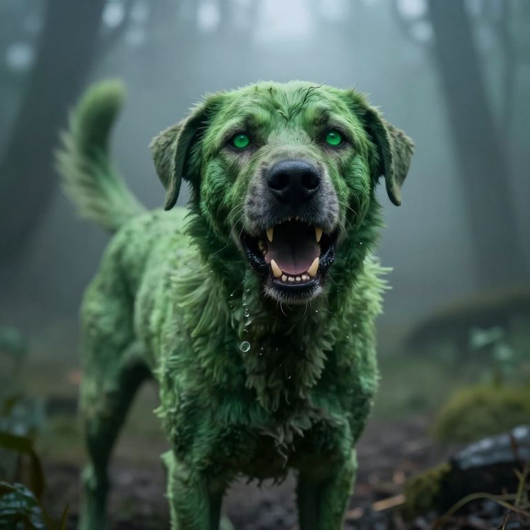 A green, mutated dog with glowing eyes bares its teeth in a misty, eerie environment.