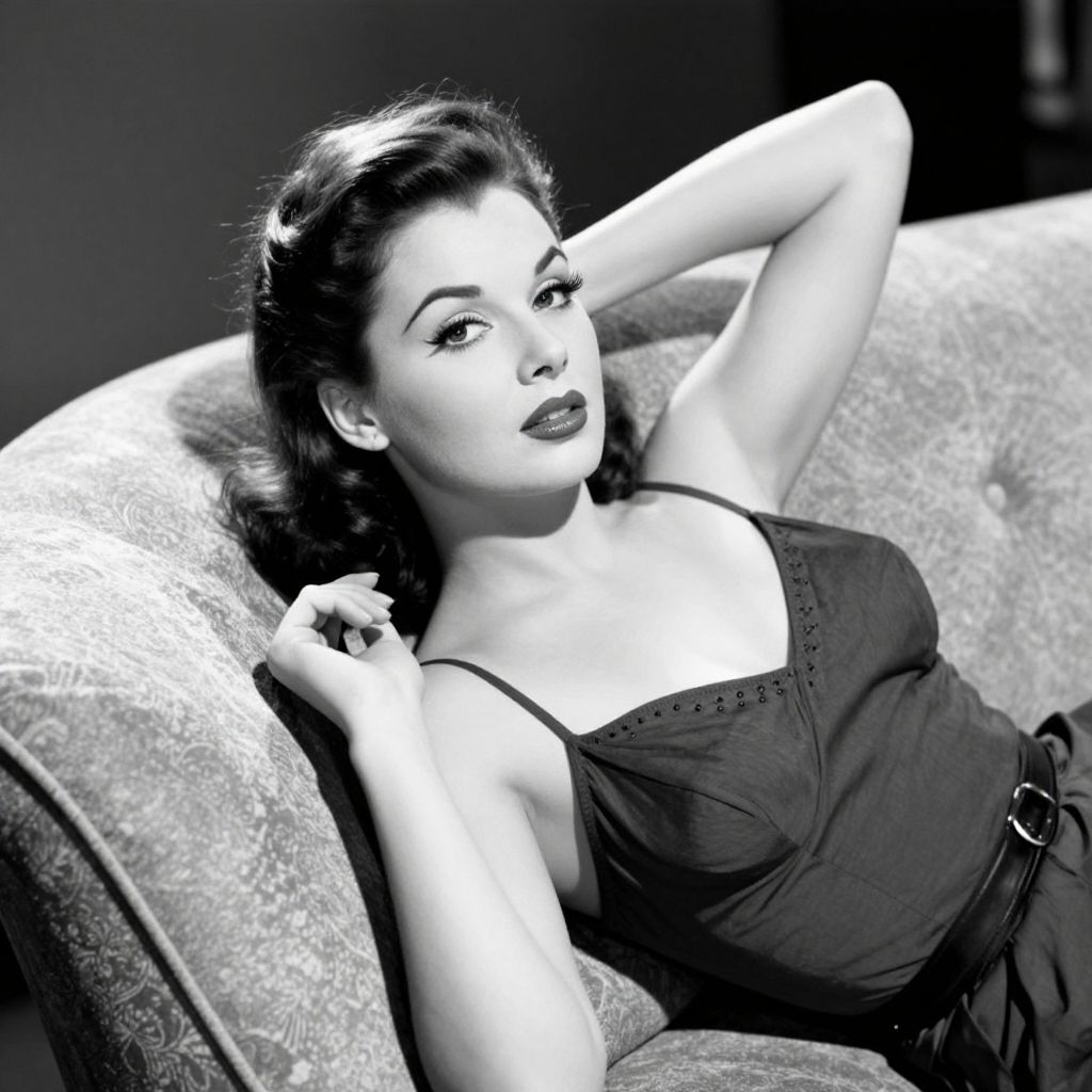 A high-definition black-and-white digital illustration depicts a woman lounging elegantly on a couch, her pose reminiscent of classic Hollywood glamour, with dramatic lighting accentuating her vintage hairstyle and bold makeup.