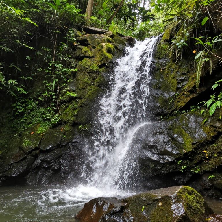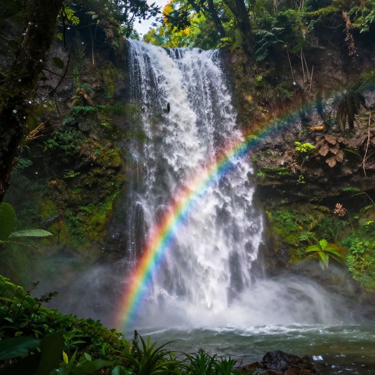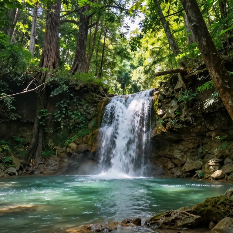 Tranquil green forest waterfall flowing into a crystal-clear pool, framed by towering ancient trees and dense greenery, gentle rays of sunlight illuminating the scene, peaceful and untouched wilderness
