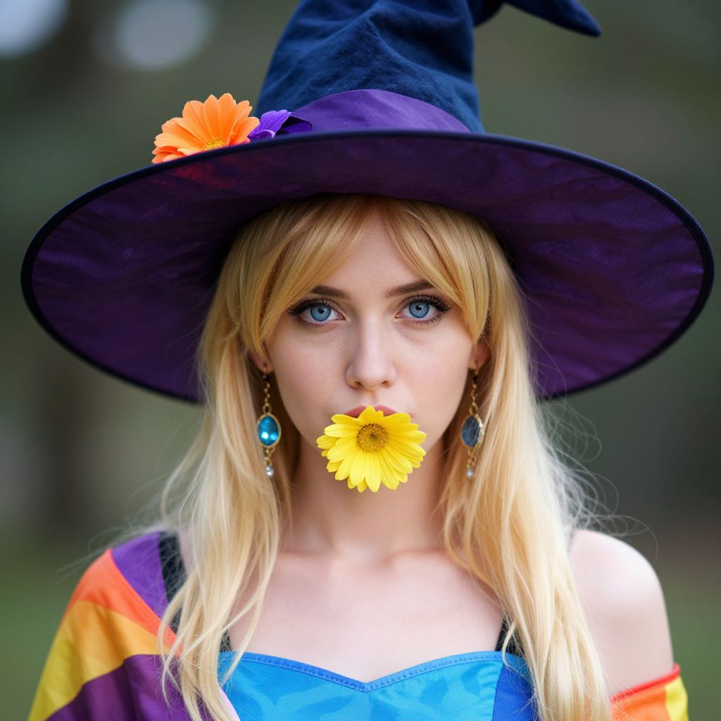 Photograph of a young blonde woman with blue eyes, wearing a black witch hat adorned with an orange flower. She has a yellow flower in her mouth and wears a colorful, off-shoulder dress with rainbow stripes. Her turquoise earrings dangle against her fair skin. The background is blurred with green and brown hues, suggesting an outdoor setting. The image has a vibrant, whimsical style, with sharp focus on the subject and a soft, dreamy effect on the background.