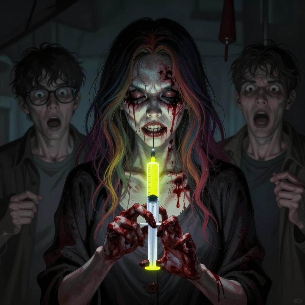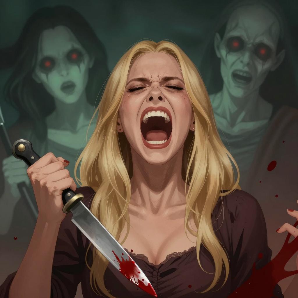 Digital illustration of a blonde woman screaming with closed eyes, holding a large blood-stained knife. She wears a dark purple top with lace detailing. Behind her are two ghostly, pale green-skinned figures with glowing red eyes and menacing expressions. Blood splatters are visible around her, adding to the intense and fearful atmosphere.