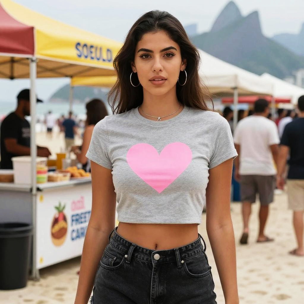 A woman, in a seven seas visual style, wearing a gray crop top with a pink heart graphic and high-waisted black jeans, standing at a Street Food Experience in Rio de Janeiro Beachfront. Sexy. Pretty face and beutiful eyes