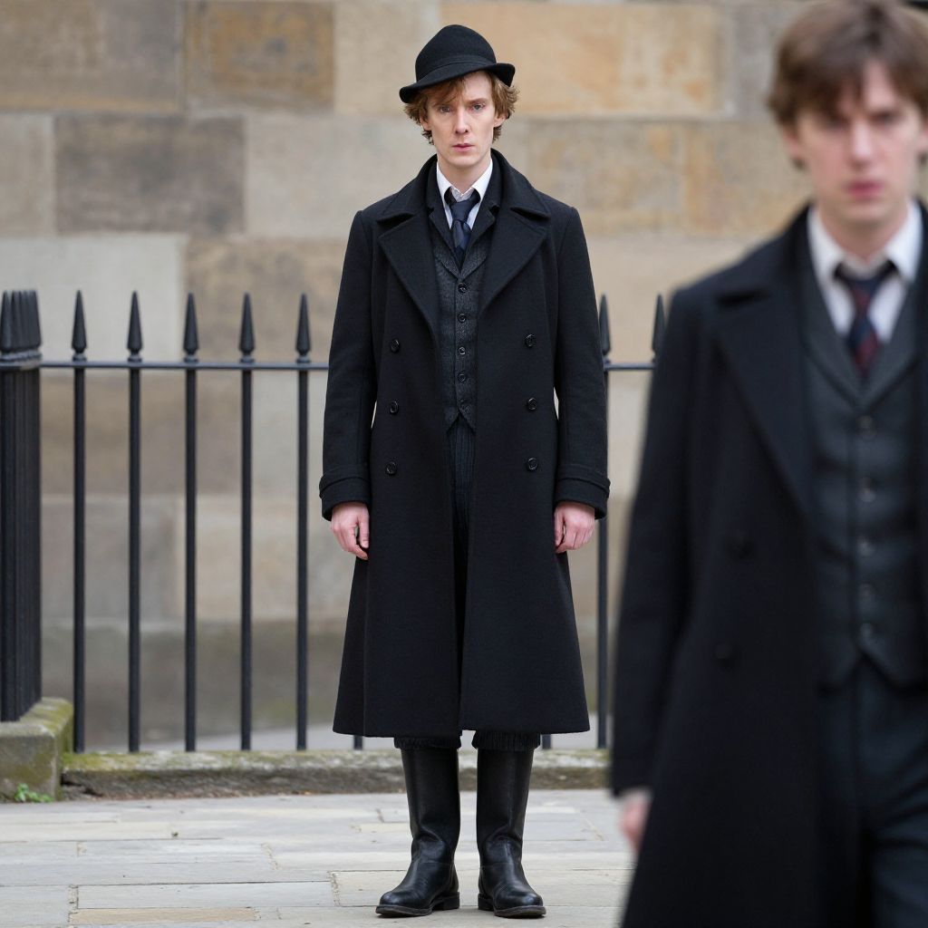 Photograph of a young white man with curly brown hair, standing in the center. He wears a black Victorian-style overcoat, matching vest, tie, white shirt, black trousers, and a black bowler hat. His expression is neutral. In the blurred foreground, another young white man in similar black Victorian attire is partially visible. The background features a stone wall and a black iron fence. The scene has a historical, formal atmosphere. The colors are predominantly black and grey, with a muted, overcast outdoor setting.