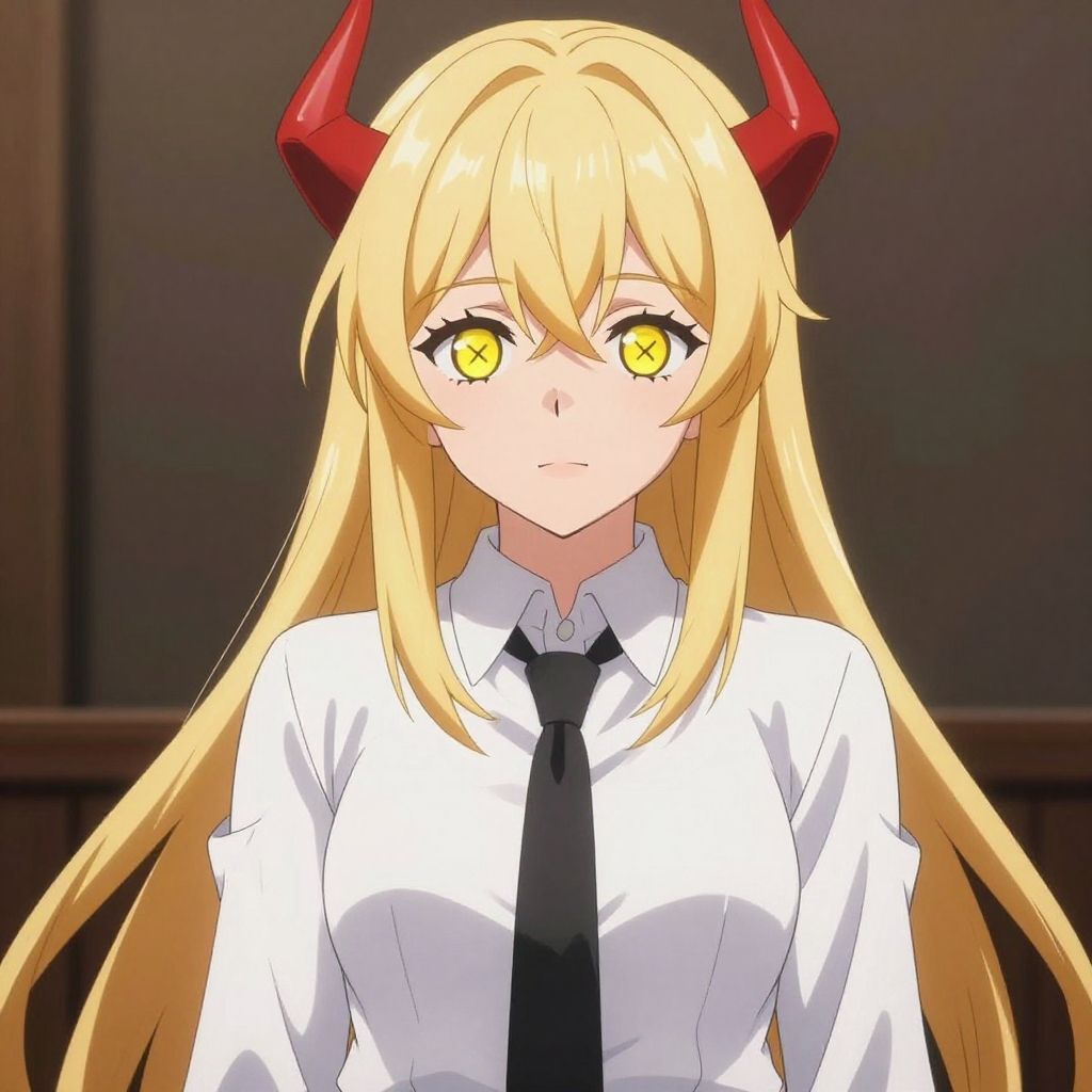 Upper body, (best quality), (masterpiece), (solo), 1girl, power_csm, blonde hair, yellow eyes, cross-shaped pupils, symbol-shaped pupils, red horns, white buttoned shirt, black necktie, csm anime style