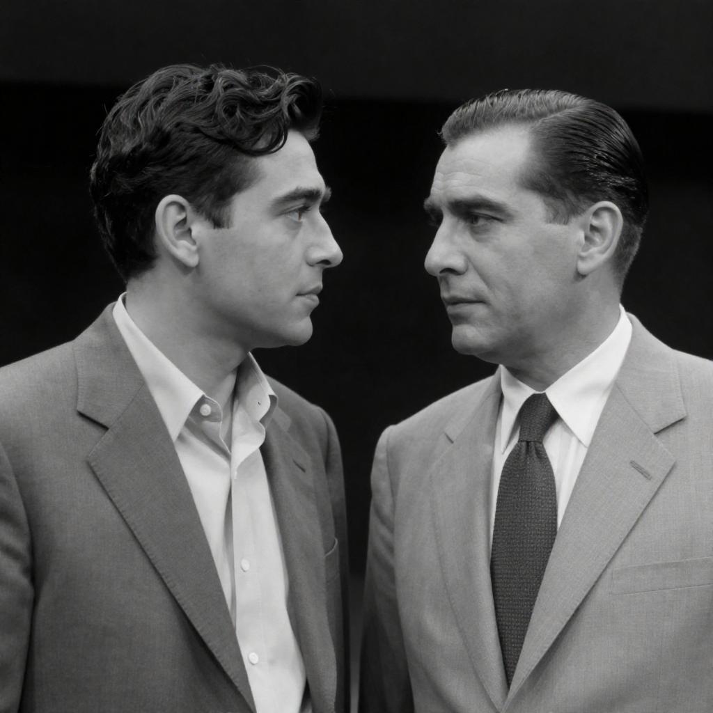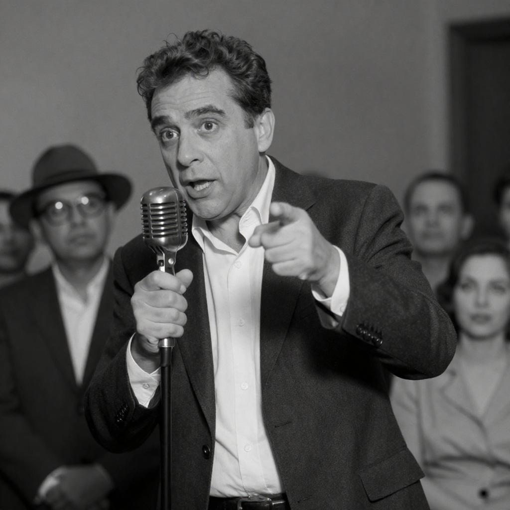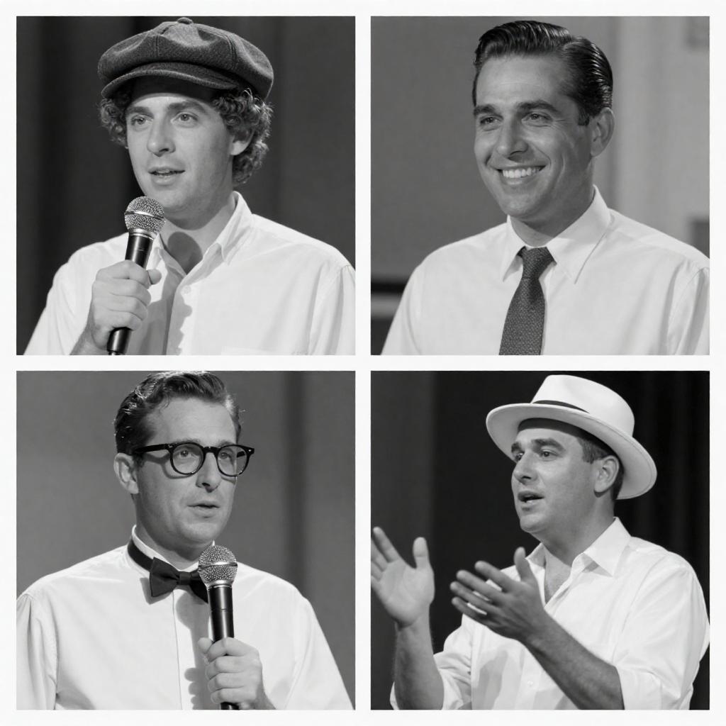 Black-and-white photograph collage of four men in vintage attire. Top left: man with curly hair, white shirt, and newsboy cap, holding a microphone. Top right: smiling man with slicked-back hair, white shirt, and tie. Bottom left: man with glasses, white shirt, and bow tie, holding a microphone. Bottom right: man with white hat, white shirt, and gesturing with hands. Backgrounds are blurred.