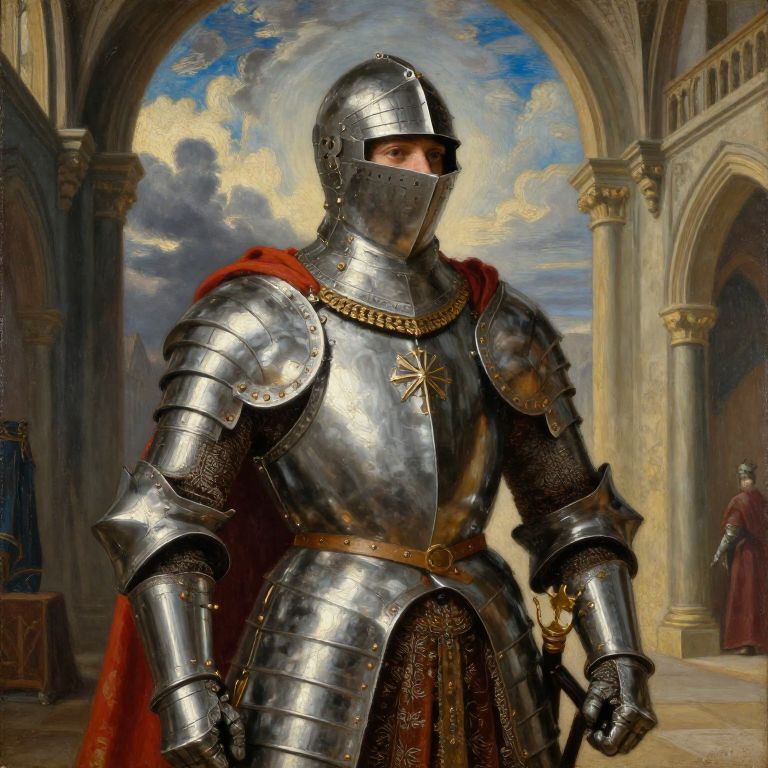 Custom renaissance painting of a regal knight in shining armor posed against a dramatic cloudy sky, with detailed metallic reflections, vibrant color palette, fine brushwork capturing textures of fabrics and skin, set in a grand medieval hall bathed in warm natural light.